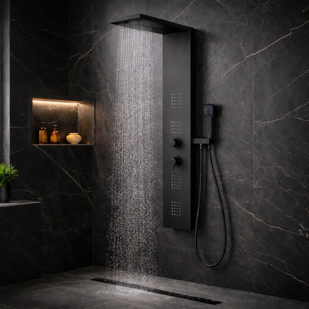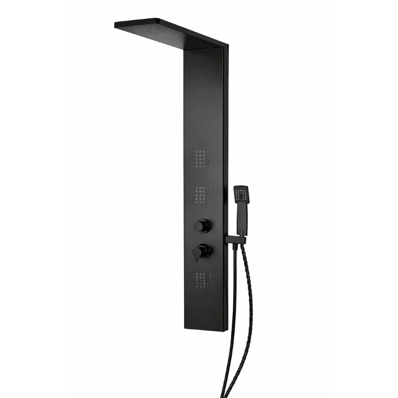 Panou de duș realizat din aluminiu acoperit, conceput pentru a oferi un echilibru optim între greutate redusă, rezistență și design modern. Tratamentul de suprafață în finisaj negru mat conferă produsului un aspect elegant și contemporan, fiind totodată rezistent la umiditate și uzură zilnică.