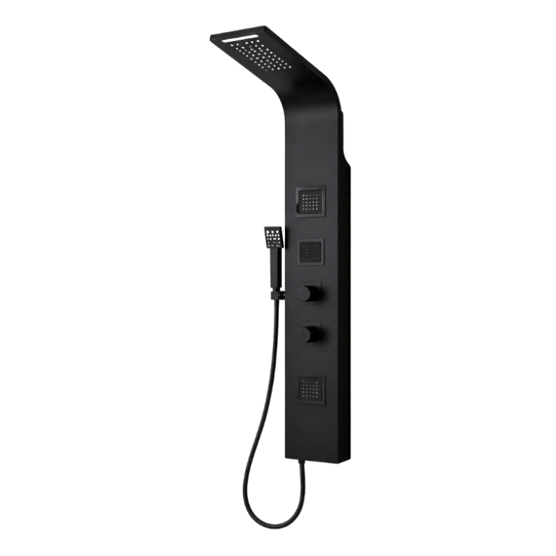 Panou de duș realizat din aluminiu acoperit, conceput pentru a oferi un echilibru optim între rezistență, greutate redusă și design contemporan. Finisajul negru mat conferă un aspect elegant și modern, fiind potrivit pentru băi cu stil minimalist sau industrial.