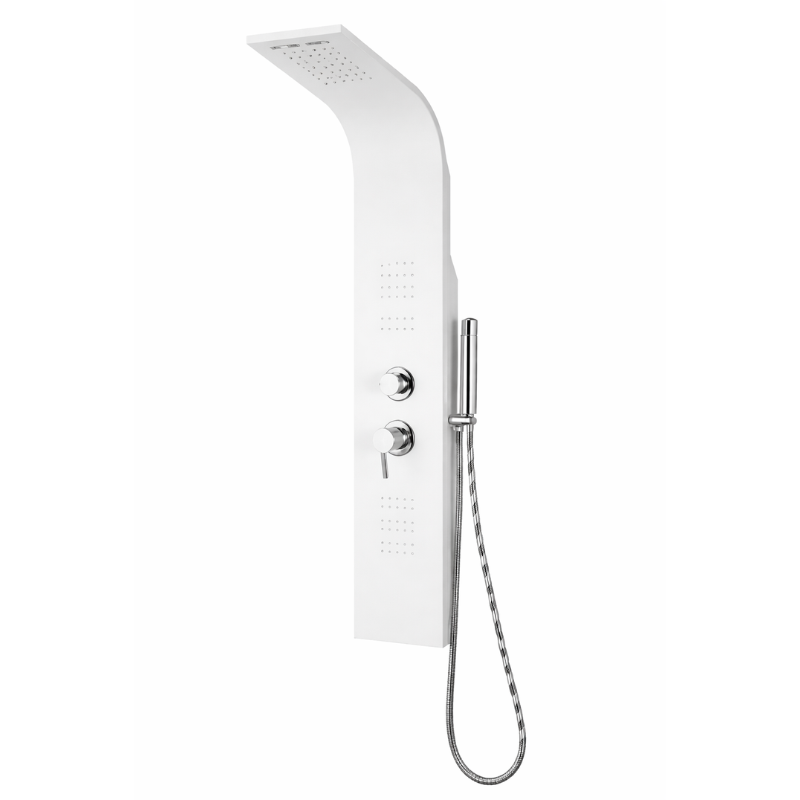 Panou de duș realizat din aluminiu, conceput pentru a oferi rezistență, stabilitate și un aspect modern, potrivit băilor contemporane. Tratamentul de suprafață în finisaj alb mat conferă un design curat și elegant, ușor de integrat în spații luminoase și amenajări minimaliste.